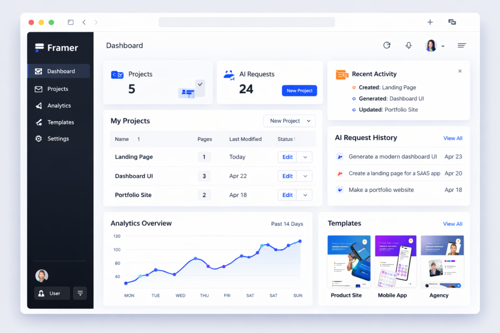 Framer combines visual design tools with artificial intelligence to generate professional websites and landing pages quickly.