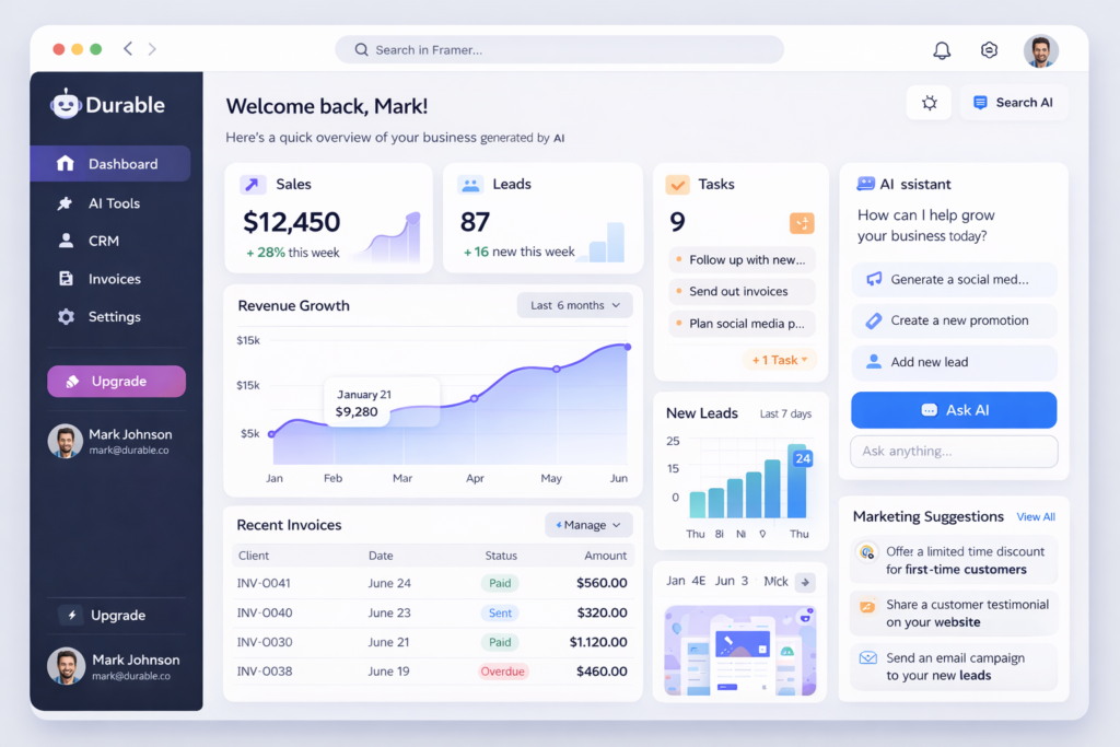 This makes Durable ideal for small businesses and freelancers who need a quick online presence.