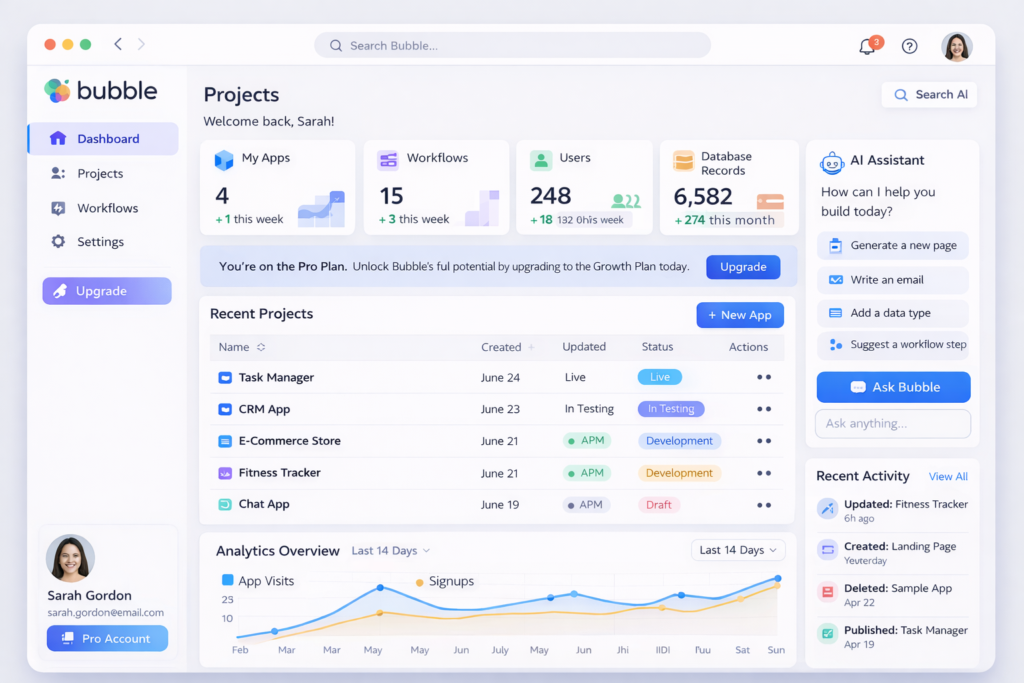 Unlike simple website builders, Bubble allows users to build full software platforms, marketplaces, and SaaS applications.