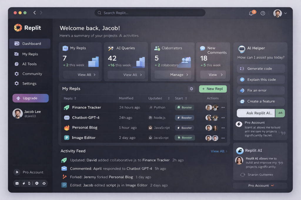 Instead of building websites automatically from prompts, Replit provides an AI assistant that helps developers write, debug, and improve code faster.